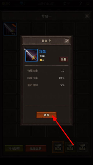 1、在背包里裝備武器,如短劍,點擊裝備按鈕可穿戴,提升物理攻擊、眩暈幾率等屬性。