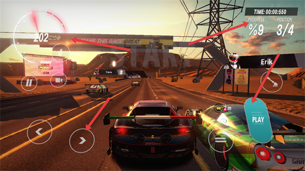 1、點擊PLAY開始比賽,在賽道上操控賽車,利用左右方向按鈕調整行駛方向,和其他賽車競爭。