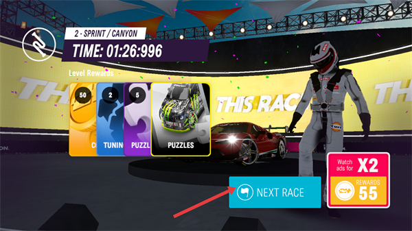 4、完成比賽后,會獲得金幣、拼圖等獎勵,點擊NEXT RACE,可繼續參與下一場賽車比賽。