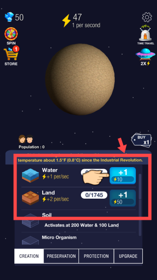 1、升級地球獲取能量:不斷點擊或放置來升級地球,地球等級越高,產生的能量就越多。能量是推動游戲進程的關鍵資源,用于后續的各種操作。