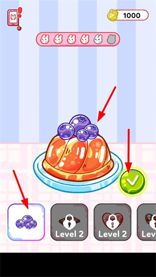 1、在果凍裝飾界面選擇對應的配料,添加到做好的果凍上,確認后點擊右側對勾按鈕,完成果凍的裝飾步驟。