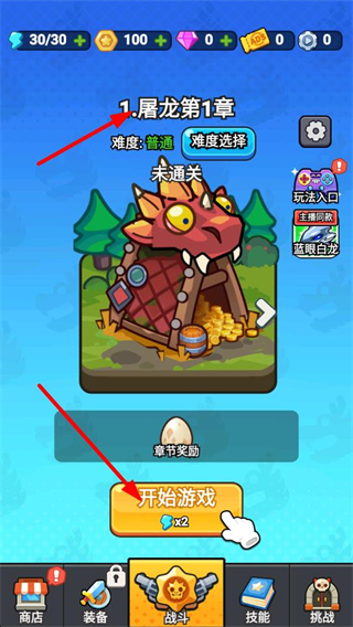 1、選擇屠龍第1章,難度為普通,點擊開始游戲消耗資源進入關卡,開啟屠龍冒險之旅。
