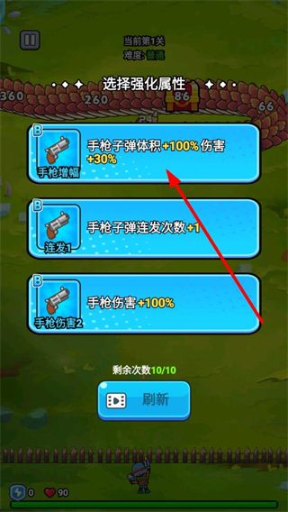 2、選擇強化屬性,如手槍子彈體積傷害增幅等選項,提升自身戰力,助力屠龍戰斗。
