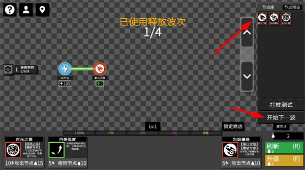 4、波次結束后進入節點界面,可配置節點技能,使用釋放波次次數,點擊開始下一波按鈕,繼續挑戰更高波次的彈幕生存關卡。