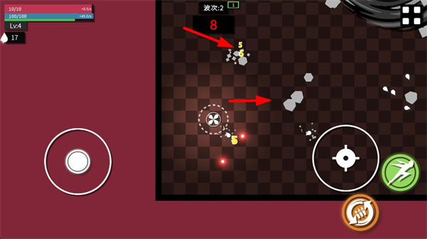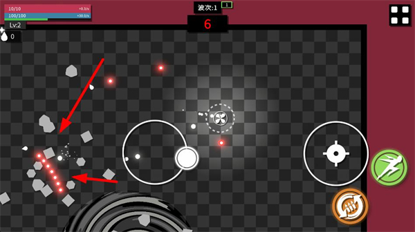 1、操控角色移動,躲避場景里的紅色子彈攻擊,同時利用攻擊按鈕反擊,提升等級積累資源,推進波次1的生存挑戰。