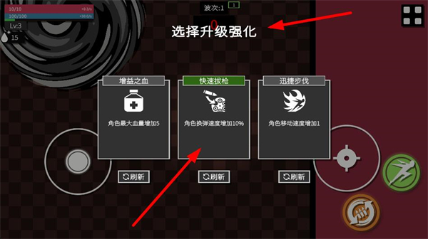 2、升級后進入強化選擇界面,可挑選增益之血快速拔槍等強化項,比如選快速拔槍提升換彈速度,增強角色的戰斗能力。