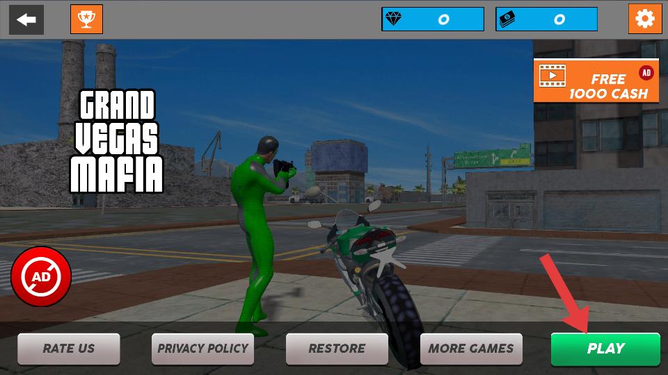 1、進入游戲主界面,能看到綠色著裝的角色和摩托車,點擊PLAY按鈕,即可開啟在拉斯維加斯的冒險。