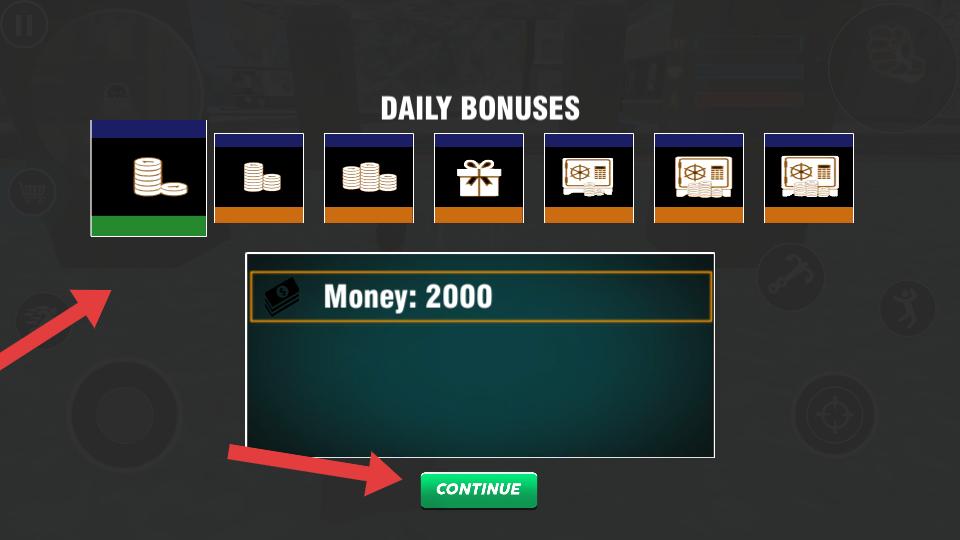 2、首次進入會彈出DAILY BONUSES界面,可領取2000Money,之后點擊CONTINUE,正式進入游戲場景。