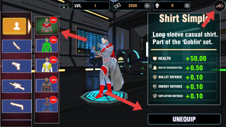 3、在角色界面,可選擇不同服裝,如Shirt Simple等,更換服裝能提升生命值,防御等屬性,打造強力角色。