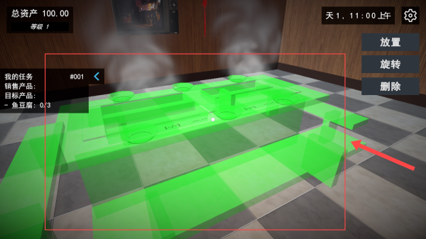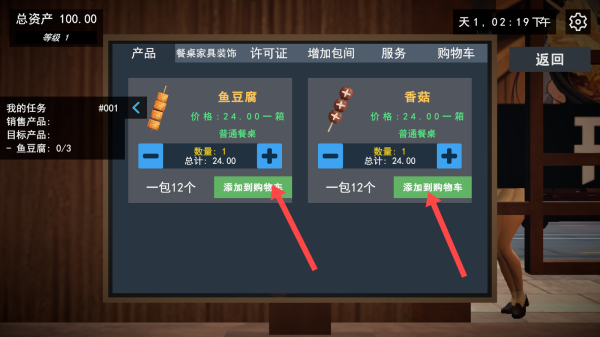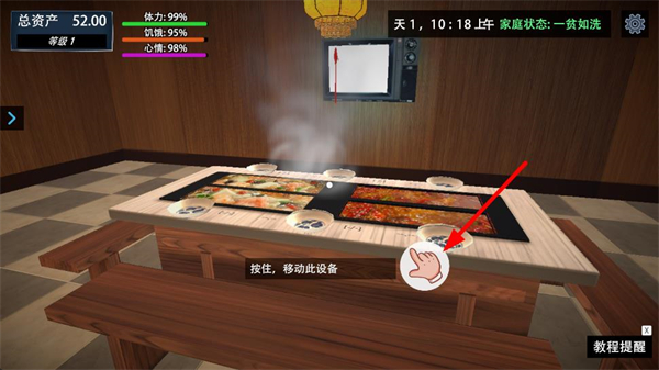 2、店鋪布置管理:進入店鋪長按家具移動擺放,點擊電腦進貨,貨物送達后拿起打開,放置關東煮至餐桌。