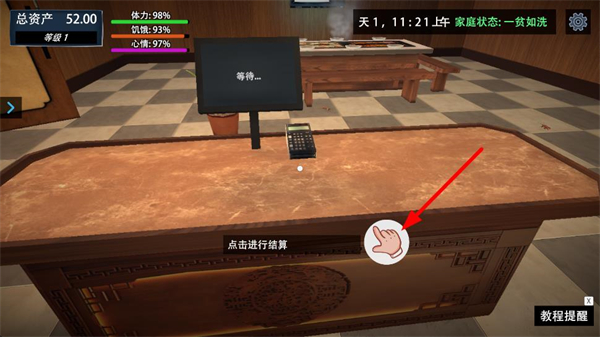 3、點擊收銀臺進行結算,完成顧客的消費交易,獲取經營收益,提升燒烤店的總資產和等級,推進經營進程。