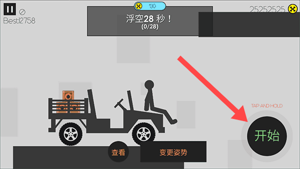 3、控制發射力度:長按開始按鈕調整發射力度,確認后點擊發射,將火柴人從載具中發射出去,觀察造成的傷害獲取分數。