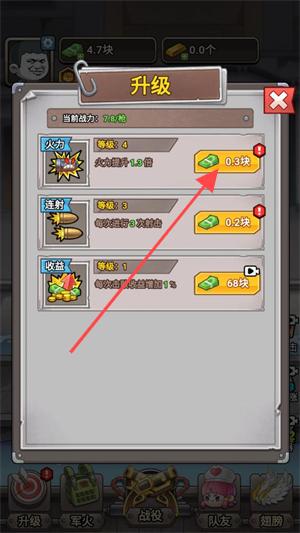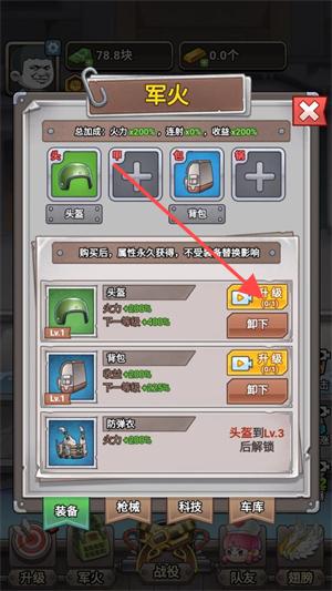 3、解鎖升級裝備:點擊軍火選項,解鎖新裝備并升級,高等級裝備帶來更強戰斗效果。