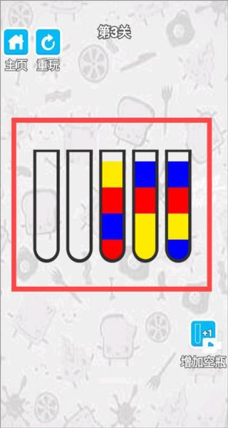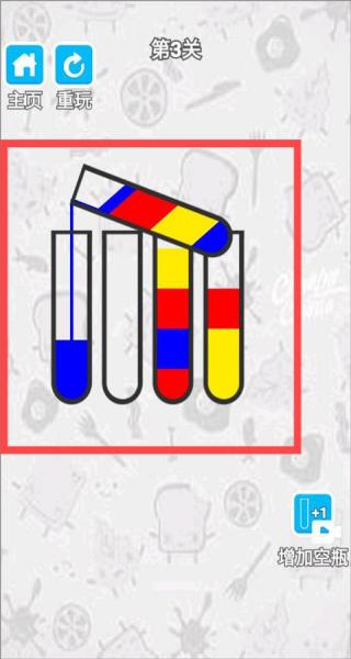 2、顏色歸類操作:點擊瓶子,將同一顏色的液體倒入同一個瓶子中,逐步實現顏色的統一歸類。