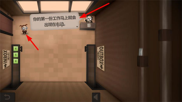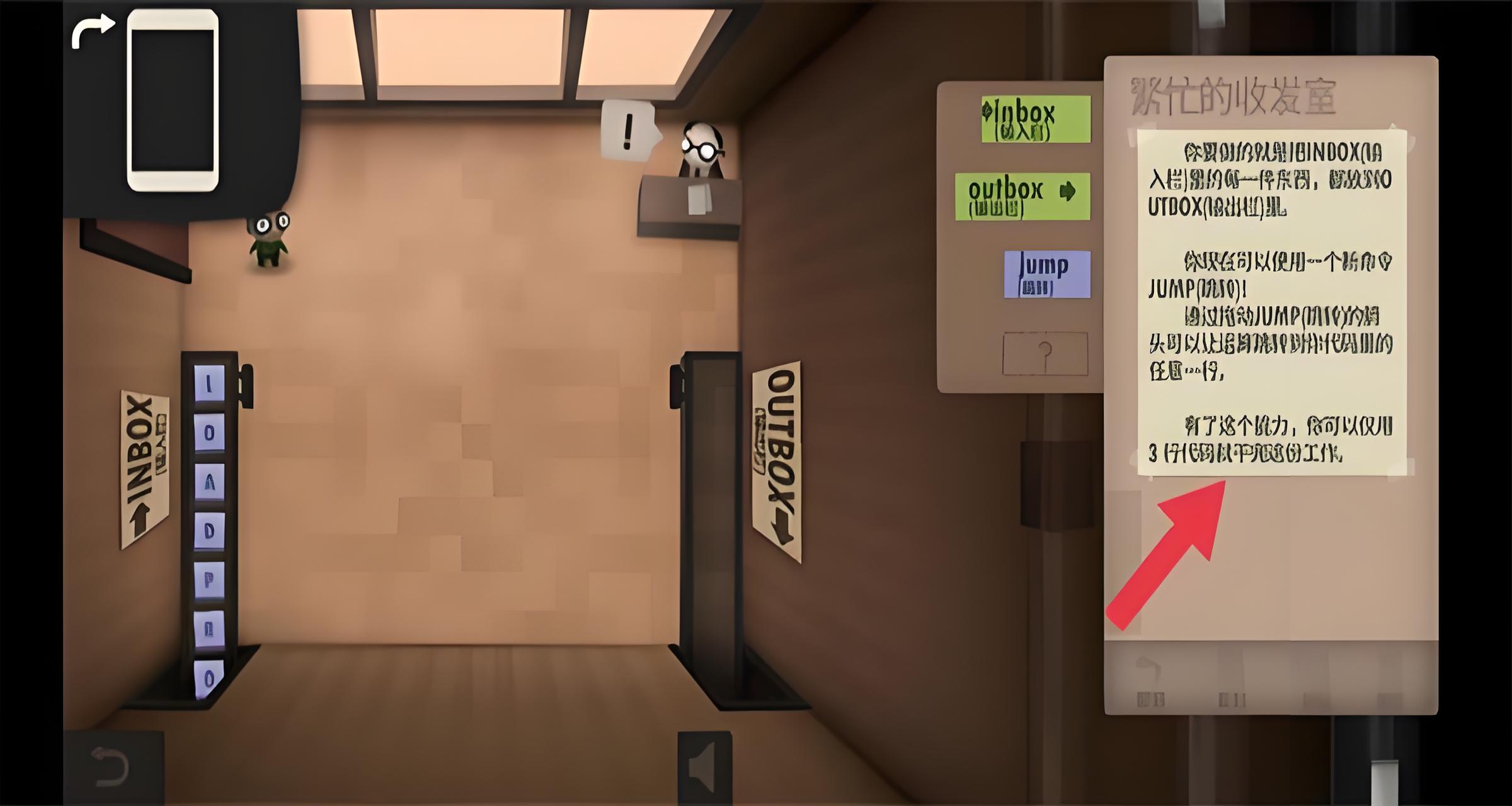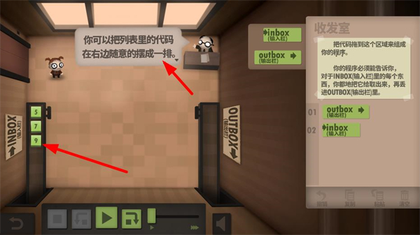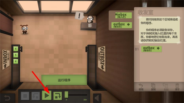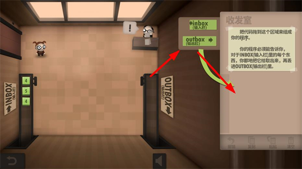 2、看到收發室的任務說明,了解到需將INBOX里的東西取出,再送進OUTBOX輸出口里,按照提示明確任務的操作流向,準備執行步驟。