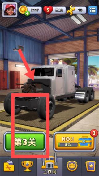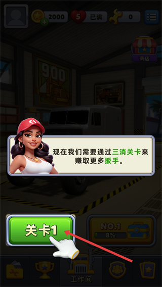 3、為獲取更多扳手,需要參與三消關卡,點擊關卡1按鈕進入,通過三消玩法來積累扳手,助力卡車修復和工廠經營。