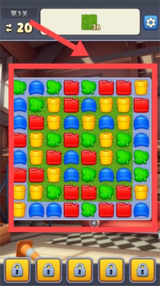1、經典消除闖關:交換方塊完成三個及以上同色圖塊消除,達成關卡目標獲取金幣、扳手等獎勵。