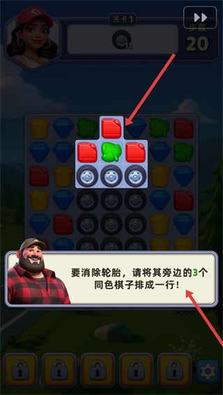4、會提示消除輪胎的規則,需將輪胎旁邊的3個同色棋子排成一行來消除輪胎,以此完成關卡目標,推進游戲進程。