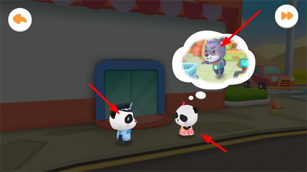 1、熊貓與其它人交流,同伴的想法氣泡顯示目標形象,明確任務指向,開啟相關搜尋環節。