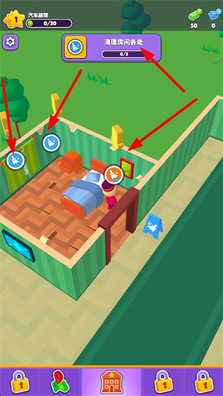 1、處理清理房間各處的任務,點擊房間內對應區域完成清理,逐步推進任務進度,積累資源助力旅館運營。