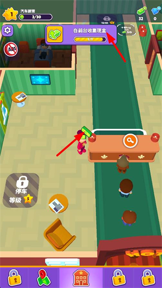 3、前往前臺區域收集現金,完成收集操作可獲得收益,這些收益可用于后續的旅館升級或人員雇傭,保障運營資源。
