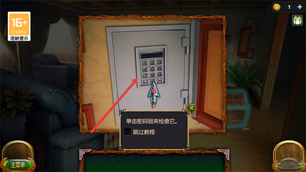 1、會遇到帶密碼鎖的保險柜,按照提示單擊密碼鎖可檢查它,開啟思考解謎的環節。