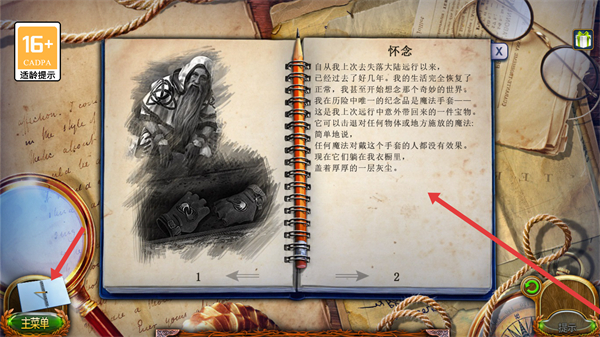 2、會出現帶有劇情的筆記本,可查看里面關于“懷念”的文字內容,同時界面有放大鏡等道具可利用。