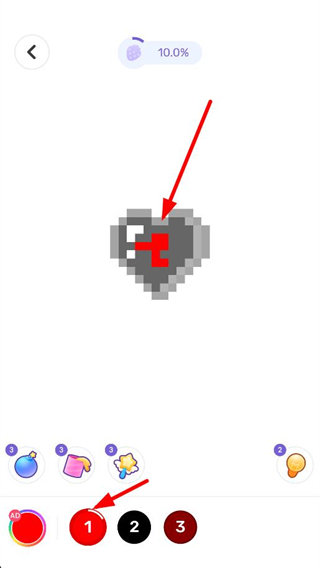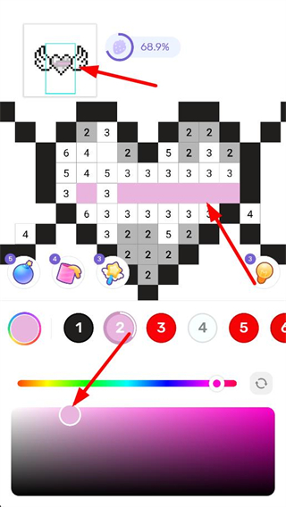 1、選中下方數字對應的顏色條,點擊對應數字的像素塊,即可為其填充顏色,進度會同步顯示。