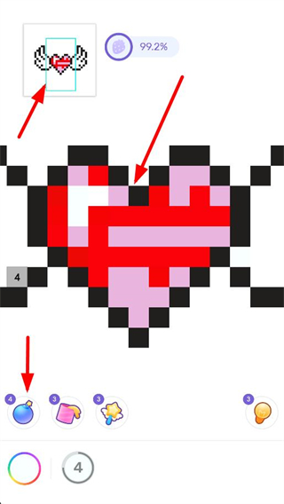 2、隨著填充的像素塊增多,上方預覽區域會逐步顯現圖案輪廓,可通過預覽查看當前完成效果,同時界面下方有道具可輔助填色操作。