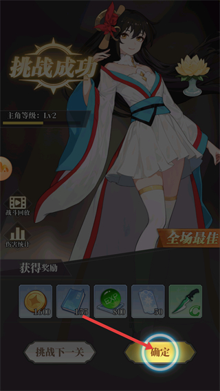 4、挑戰成功后出現挑戰成功界面,點擊確定按鈕領取金幣、道具等獎勵,也可選擇挑戰下一關繼續游戲。