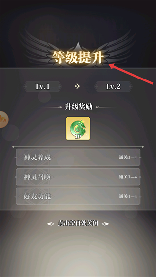3、戰斗勝利后角色等級提升,同時解鎖神靈養成、神靈召喚、好友功能等新玩法,獲得升級獎勵。