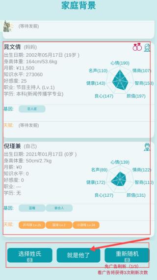 1、玩家進入后可以根據自己的選擇來刷新自己想要的背景和家庭如果滿意就點擊屏幕下方中間的確定按鈕進入。