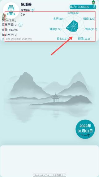 2、進入劇情后在屏幕的上方可以觀看自己的各項的屬性以及存款等這些屬性將影響游戲劇情的進展和推進。