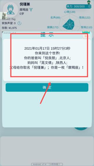 2、抓鬮后出現對應的反饋提示,點擊確定按鈕關閉提示界面,繼續體驗角色后續的人生事件。