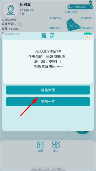 3、遇到媽媽生日的事件提示,選擇哇哇大哭或嘻嘻一笑等選項,做出互動選擇,影響角色的相關屬性。