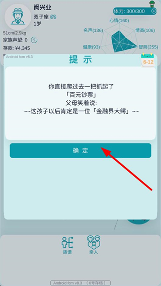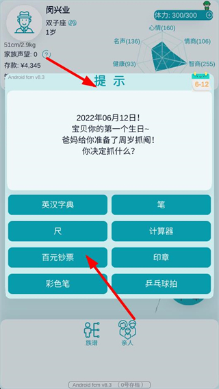 1、在周歲抓鬮的界面提示下,選擇百元鈔票選項,完成抓鬮互動,推進角色的人生發展流程。