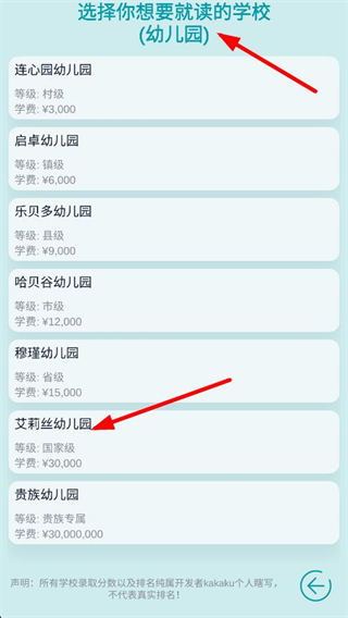 4、進入幼兒園選擇界面,查看不同學校的等級和學費,選擇艾莉絲幼兒園等選項,確定就讀的學校推進流程。