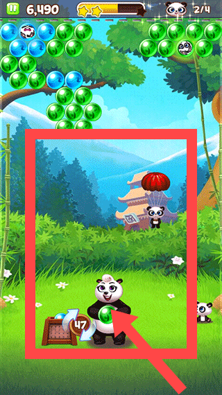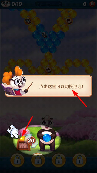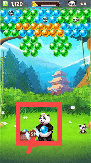 2、選擇對應顏色的泡泡發射,消除目標區域的泡泡來解救熊貓寶寶,積累解救數量并獲取積分。