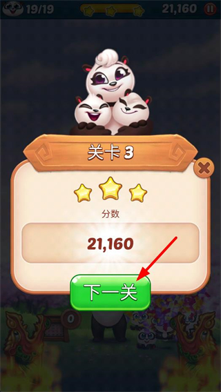 3、完成關卡的熊貓寶寶解救后,查看三星評價與得分,點擊下一關按鈕,準備進入新的救援關卡。