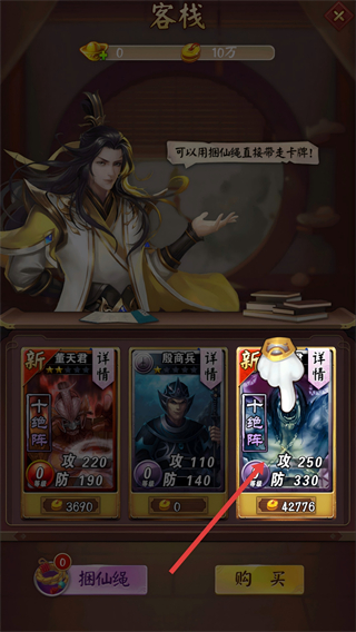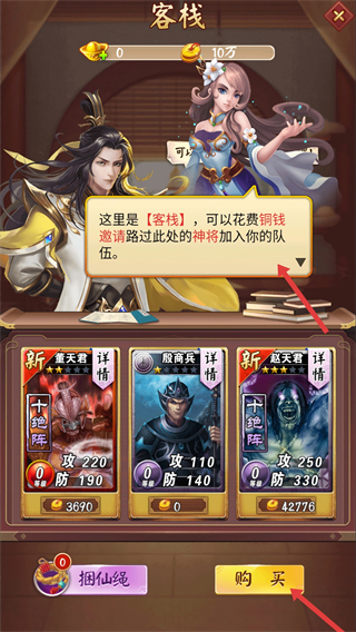 1、在客??苫ㄙM銅錢邀請神將加入隊伍,也可點擊購買按鈕獲取神將,不斷擴充隊伍實力。