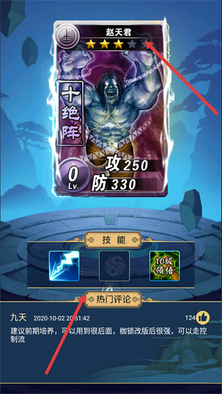 3、獲得的卡牌如趙天君有攻、防屬性和技能,可查看卡牌詳情了解其能力,便于策略搭配。