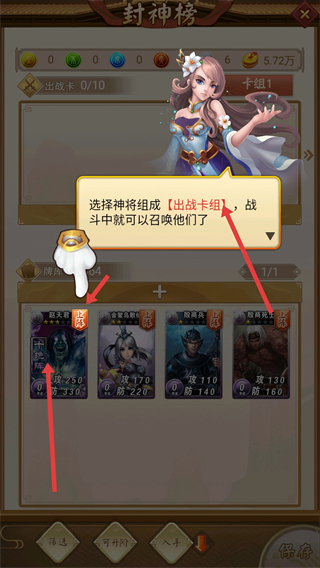 4、可選擇神將組成出戰卡組,召喚他們參與戰斗,合理組建卡組能提升戰斗勝率。