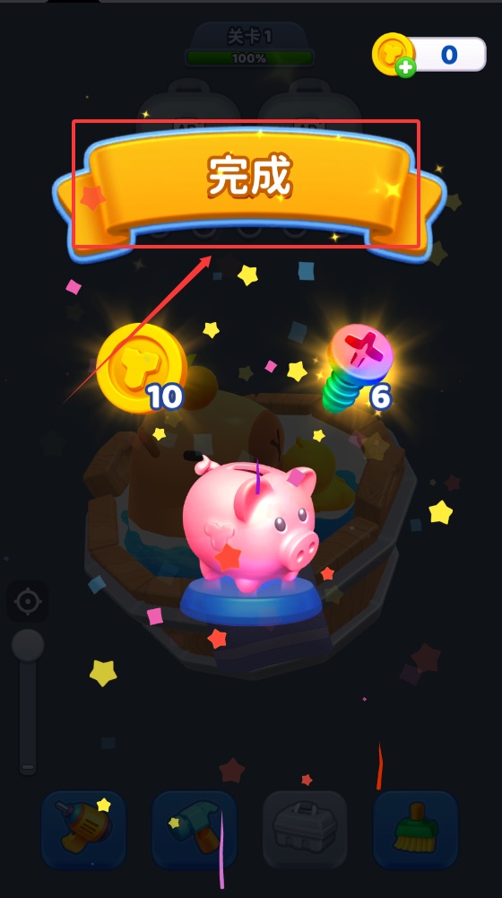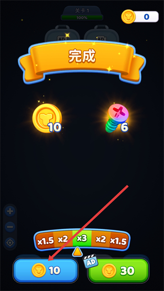 3、關卡完成后會出現完成界面,玩家可獲得金幣和燈泡獎勵,還能選擇領取獎勵或觀看廣告翻倍獎勵。