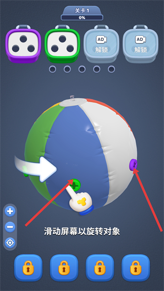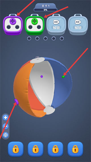 1、玩家滑動屏幕以旋轉對象,通過操作可對3D物體進行組裝,同時界面顯示關卡進度和工具選項。