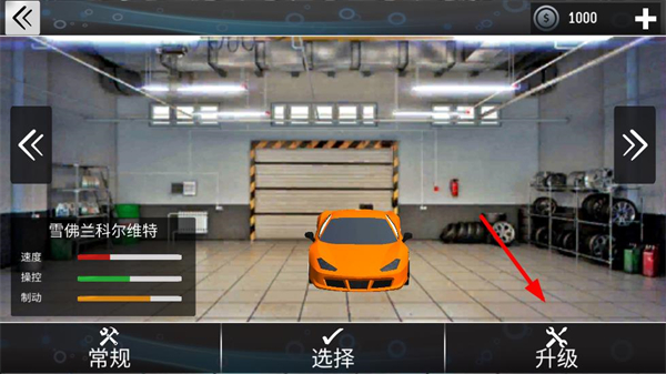 4、關卡結束后進入車庫界面,可查看當前車輛的屬性,點擊升級按鈕提升車輛性能,增強后續挑戰的行駛與超車能力。