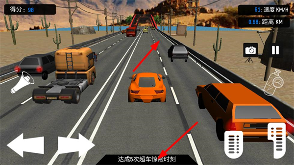 3、持續在關卡里完成超車操作,朝著達成5次超車驚險時刻的目標推進,過程要注意車速與車距,避免碰撞影響挑戰進程。