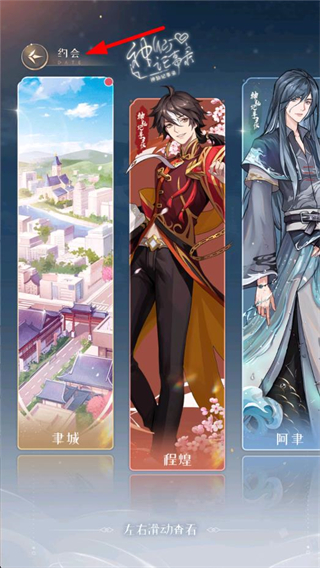 1、進入約會界面,能看到聿城程煌阿豐等選項,可左右滑動查看更多內容,選擇對應的選項開啟相關互動或劇情。