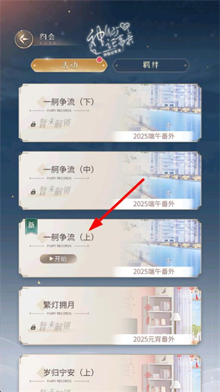 2、在約會界面切換到活動標簽,能看到一舸爭流等活動條目,找到已解鎖的內容后點擊開始按鈕,即可進入對應劇情。