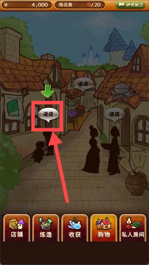 2、點擊店鋪按鈕后,進入小鎮場景界面,找到紅框及箭頭標注的進店按鈕,點擊該按鈕進入店鋪內部。