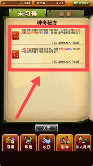 3、在店鋪內神奇秘方選項,進入秘方查看界面,瀏覽秘方內容,了解煉制方法及對應書籍,可據此進行相關煉制操作,推進游戲中煉藥玩法的進程。